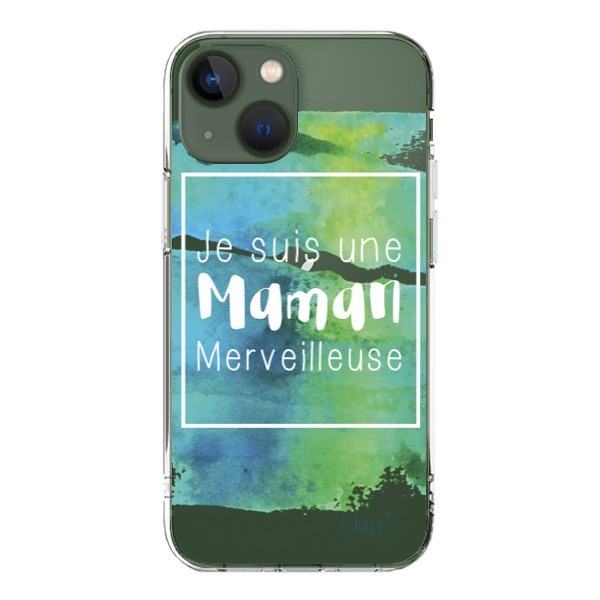 Coque iPhone 13 Je suis une Maman Merveilleuse Bleu Vert Transparente - Chapo